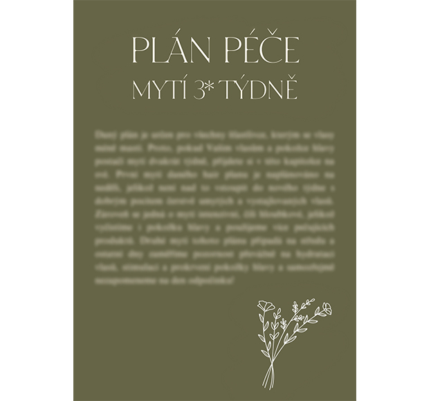 Jak již víte, klíčem k Vašim vysněným vlasům je kromě kvalitní kosmetiky též správná péče o vlasy. Co je Vám však platné, že máte teorii v malíčku, když ji neaplikujete? Přesně z tohoto důvodu jsem vytvořila tento e-book, který obsahuje jak základní týdenní plány péče o vlasy, které Vás povedou den po dni, tak popis všech jednotlivých kroků. Stručně jsem Vám v závěru shrnula též péči mimo hair plan, aby pro Vás byl tento e-book komplexním řešením Vašich trablí s vlasy. Na jeho konci na Vás navíc čeká malé překvapení, díky kterému budete mít o Vaší vlasové rutině přehled. Proto věřím, že Vám daný e-book přinese do Vaší péče o vlasy řád a po jeho přečtení budete mít základní znalosti ze všech oblastí péče, tedy Vašim vlasům už nebude v rozkvětu nic bránit.