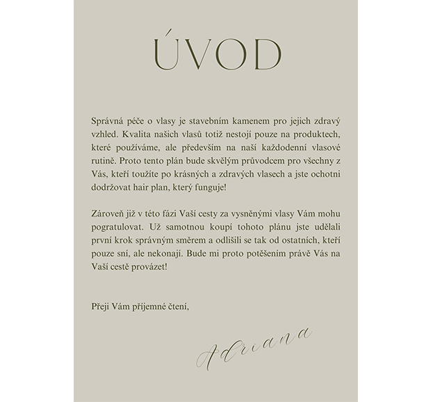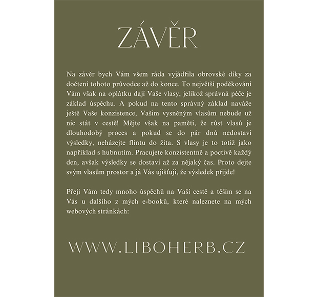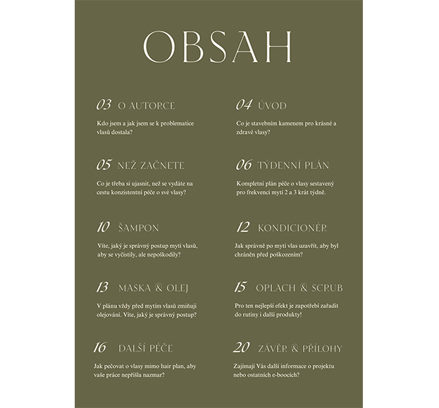 Jak již víte, klíčem k Vašim vysněným vlasům je kromě kvalitní kosmetiky též správná péče o vlasy. Co je Vám však platné, že máte teorii v malíčku, když ji neaplikujete? Přesně z tohoto důvodu jsem vytvořila tento e-book, který obsahuje jak základní týdenní plány péče o vlasy, které Vás povedou den po dni, tak popis všech jednotlivých kroků. Stručně jsem Vám v závěru shrnula též péči mimo hair plan, aby pro Vás byl tento e-book komplexním řešením Vašich trablí s vlasy. Na jeho konci na Vás navíc čeká malé překvapení, díky kterému budete mít o Vaší vlasové rutině přehled. Proto věřím, že Vám daný e-book přinese do Vaší péče o vlasy řád a po jeho přečtení budete mít základní znalosti ze všech oblastí péče, tedy Vašim vlasům už nebude v rozkvětu nic bránit.